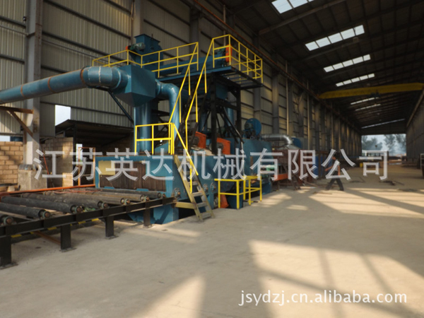 板材預(yù)處理線 型材預(yù)處理線為連續(xù)送料的高功能連續(xù)作業(yè)清理,在清理過程中由電氣控制的變頻電機(jī)驅(qū)動輥道將工件送進(jìn)清理機(jī)室體內(nèi)拋射區(qū)時(shí),其周身各面受到來自不同坐標(biāo)方位的強(qiáng)力密集彈丸的打擊與磨擦,使工件上的氧化皮及其污物迅速脫落,工件表面獲得粗糙度的光潔表面。落入工件上面的彈丸與銹塵經(jīng)回收螺旋輸送到彈丸循環(huán)系統(tǒng),由清理室外兩邊裝卸工件。清理過程中,撒落下來的丸塵混合物經(jīng)室體漏斗、縱橫向螺旋輸送機(jī)匯集于提升機(jī)下部,再提升到機(jī)器上部的分離器里,分離后的純凈彈丸落入分離器料斗中,供拋丸循環(huán)使用。拋丸清理過程中產(chǎn)生的塵埃由抽風(fēng)管送向除塵系統(tǒng),凈化處理后的凈氣排放到大氣中,顆粒狀塵埃被捕捉收集。