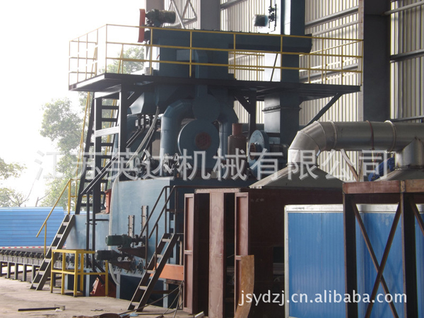 主要部件由清理室,輥道輸送機(jī)、拋丸器、彈丸循環(huán)系統(tǒng)(含提升機(jī)、分離器、縱向螺旋輸送器和供丸管道)、除塵、清掃、電氣控制等部件組成。